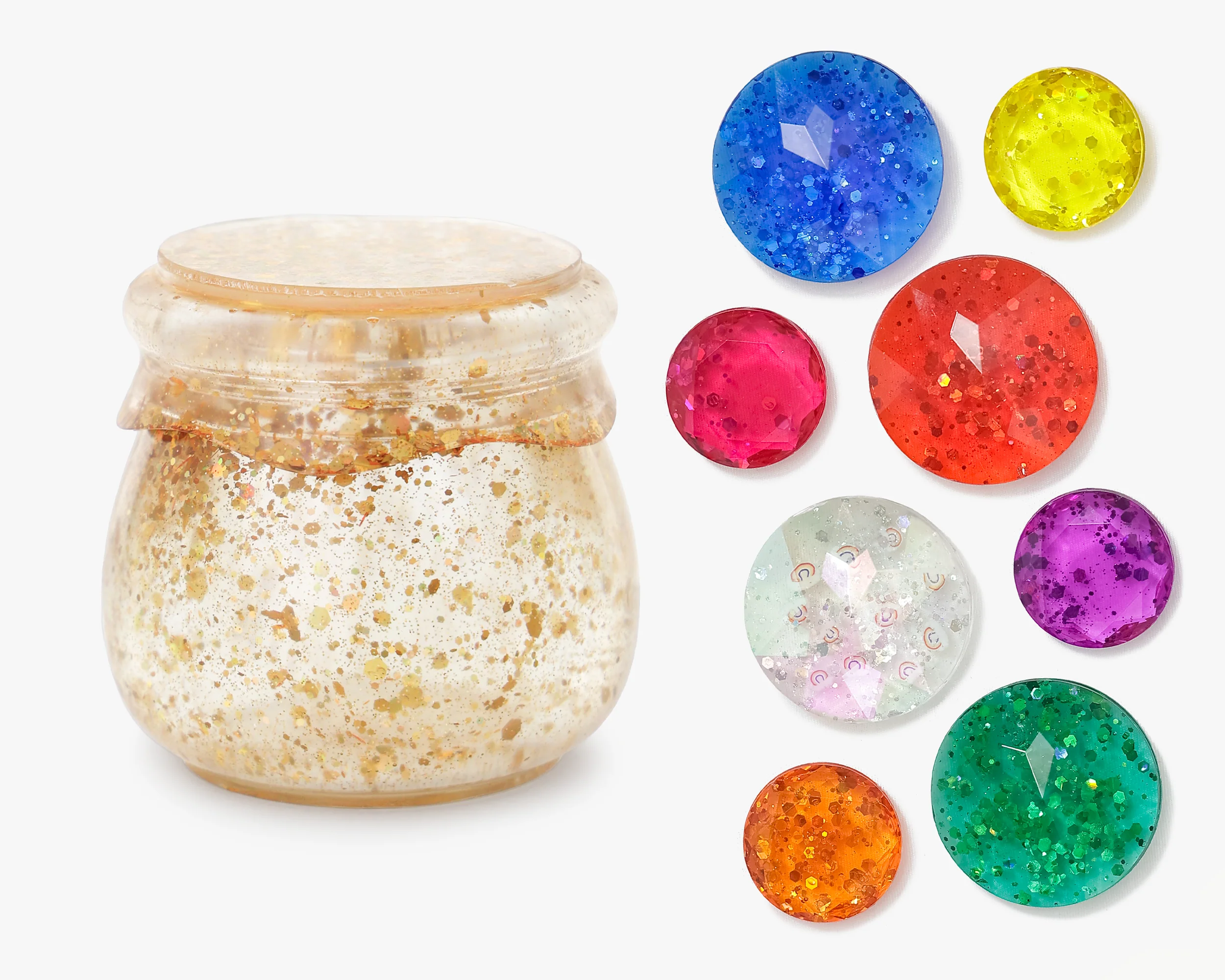 Each gem is crafted to capture the imagination — filled with swirling glitter, shimmering flecks, and one extra-special rainbow-filled treasure that feels like it was discovered at the end of a storybook rainbow.