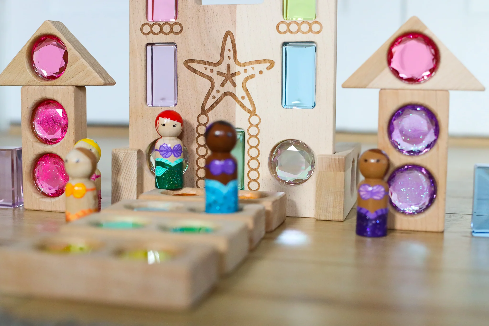 *Each mermaid castle bundle comes with one castle, a set of two stand blocks, and/or Rainbow Blocks. Each castle has been laser engraved with details on one side. The other side is blank.
